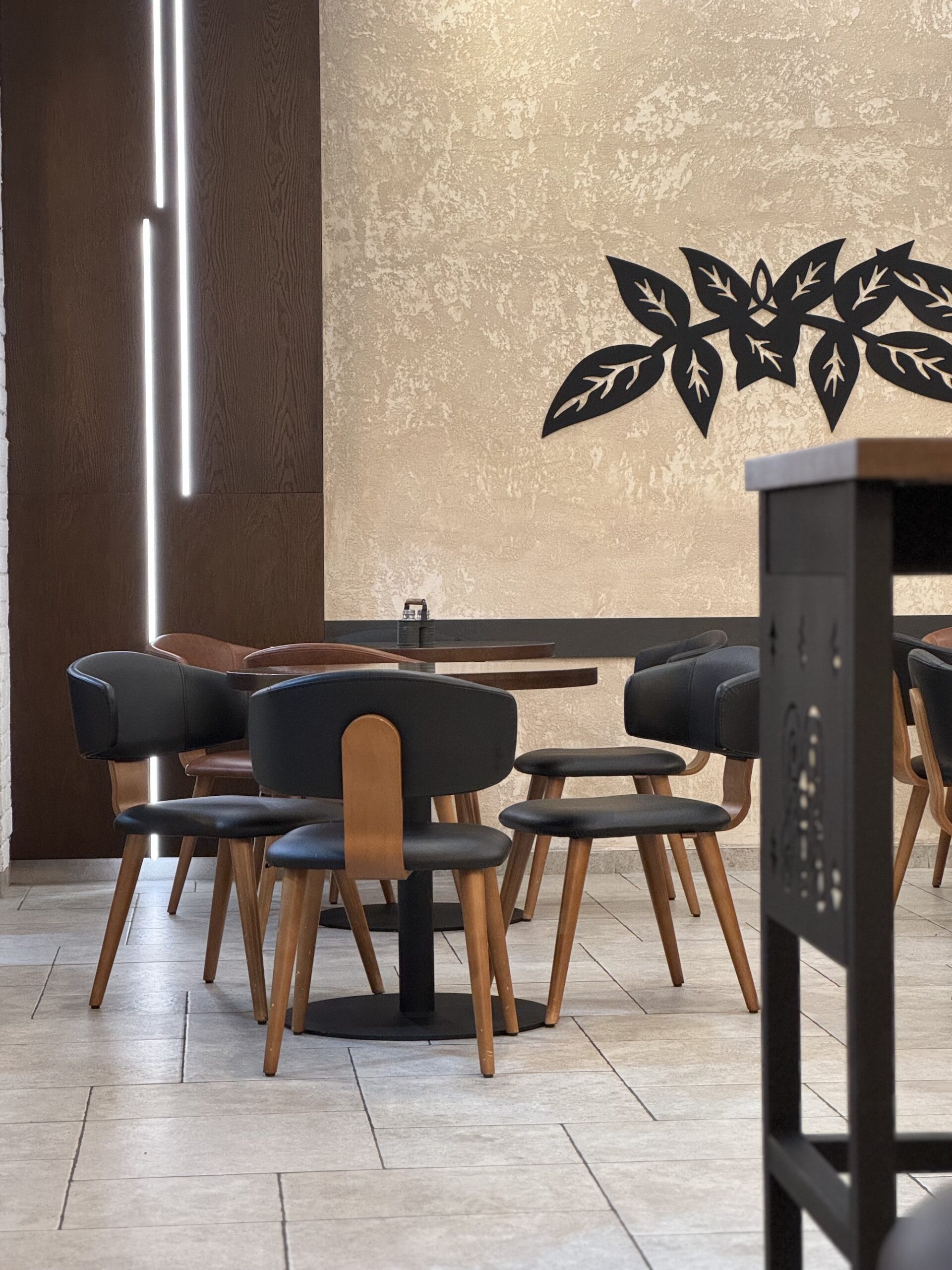 Projekat enterijera pekare Žuna u Požegi rađen je sa akcentom na toplinu materijala i skladan spoj tradicionalnih i modernih elemenata. Zidni paneli i dekoracije pažljivo su dizajnirani kako bi prostoru dali karakter i vizuelnu dubinu. Drvene grede sa integrisanom rasvetom rađene od furniranog bajcovanog medijapana, unose osećaj autentičnosti, dok stolovi izrađeni od iverice u kombinaciji sa metalnim detaljima, doprinose savremenom industrijskom izrazu. Kuhinjski frontovi su izrađeni od furniranog medijapana, koji ne samo da vizuelno obogaćuju radni deo, već i čine stilsku i materijalnu vezu sa dekorativnim gredama na plafonu. Na taj način postignuta je harmonična linija koja vodi pogled kroz prostor i dodatno naglašava kontinuitet dizajnerske ideje.